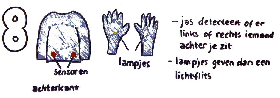 -Een jas met reflectors en sensoren. De reflectors zorgen dat de gebruiker beter gezien wordt. De sensoren detecteren via sonar ander verkeer op de weg en laten dit middels tactiele of auditieve feedback aan de gebruiker weten.