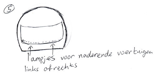 4. Ook hierbij zijn de oplossingen verdeeld over de motor en de helm. Achterop de helm zit een camera en dat beeld wordt live uitgezonden in het beeld van de bestuurder in de helm. Dat beeld kan aan- en uitgezet worden door een knopje op het stuur. Het beeld is transparant zodat het werkelijke zicht ook zichtbaar is. Ook is er een afstandmeter in gebouwd.